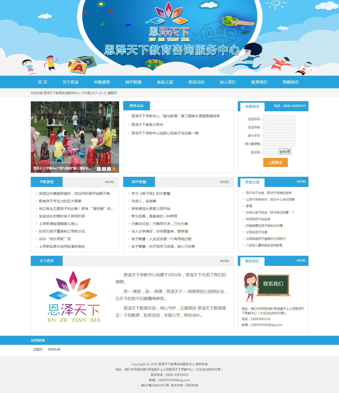 閱讀(dú) · 發布日期 2017-12-21恩澤天下(xià)早教中心創建于2016年(nián),恩澤天下(xià)代表了我們的理想,恩---感恩,澤---恩德,恩澤天下(xià)---恩德澤被蒼生(shēng),意思就(jiù)是天下(xià)蒼生(shēng)都受到(dào)其恩惠。 恩澤天下(xià)教育宗旨:用心守護,讓愛陪伴 恩澤天下(xià)教育理念:個(gè)别教育,私密談話,關愛心靈,陪伴成長(cháng)。 恩澤天下(xià)教育原則: 1、同一(yī)性:每一(yī)個(gè)孩子都存在真善美愛,我們要激發他們原有的真善美愛; 2、差異性,每一(yī)個(gè)孩子都是世界上(shàng)獨一(yī)無二的個(gè)體,我們要遵從(cóng)孩子們的特點因材施教。 恩澤天下(xià)教育目标:培養出